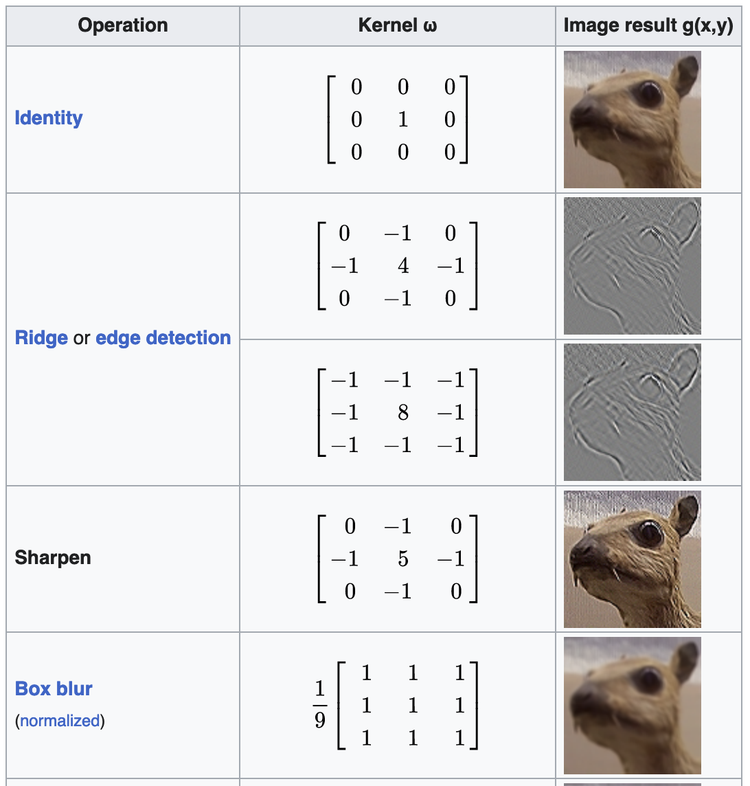 Convolution kernels, in image processing, is a small matrix used to modify an image. It's a thing that takes an image and does things to it. For example: