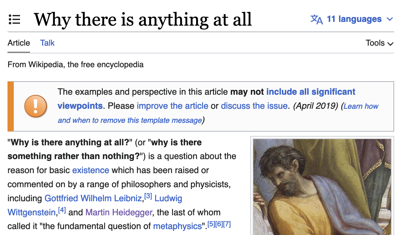 For metaphysicians like Martin Heiddeger, it's just the first step that leads to the fundamental question, "why is there something rather than nothing?", or as my new favorite Wikipedia page puts it: